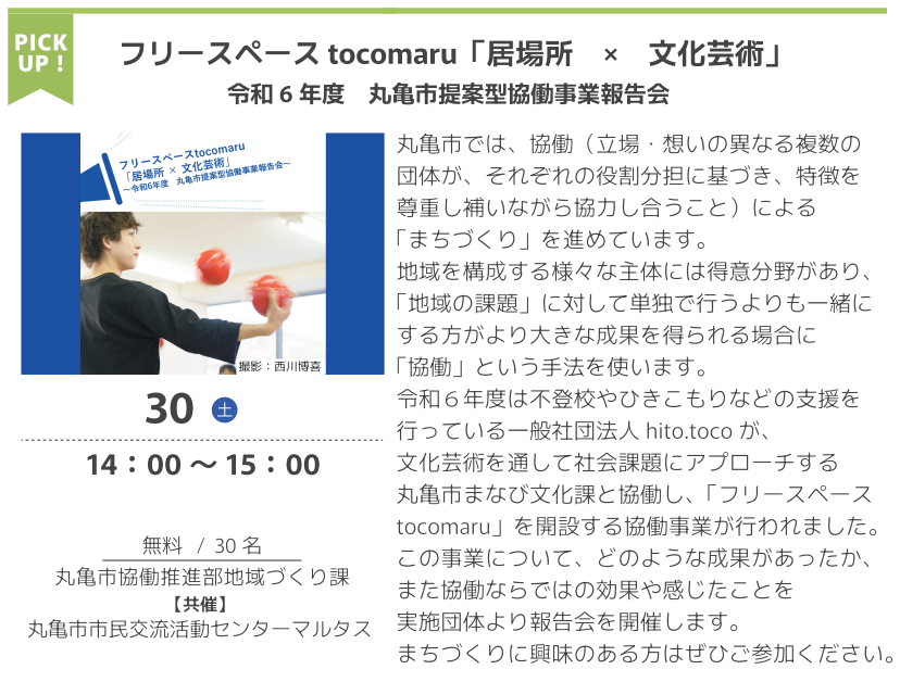 【8/30(土)イベント】フリースペース tocomaru「居場所×文化芸術」 令和6年度丸亀市提案型協働事業報告会のご案内