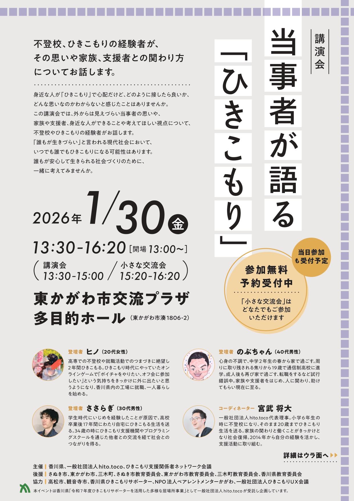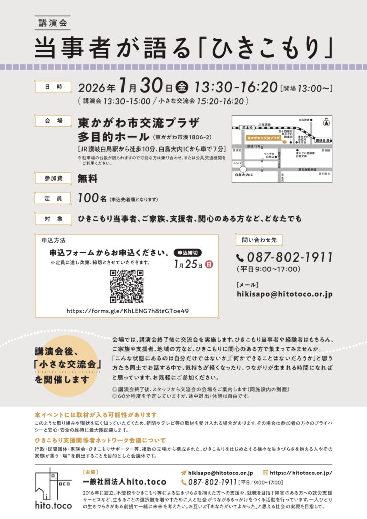 本公演会は香川県委託事業として一般社団法人hito.tocoが受託し、運営は、行政・民間団体・家族会・ひきこもりサポーター等複数の立場から構成された『ひきこもり支援関係者ネットワーク会議』を立ち上げ、ひきこもりを始めとする様々な生きづらさを抱える人やその家族が集う”場”を創出することを目的にしています。