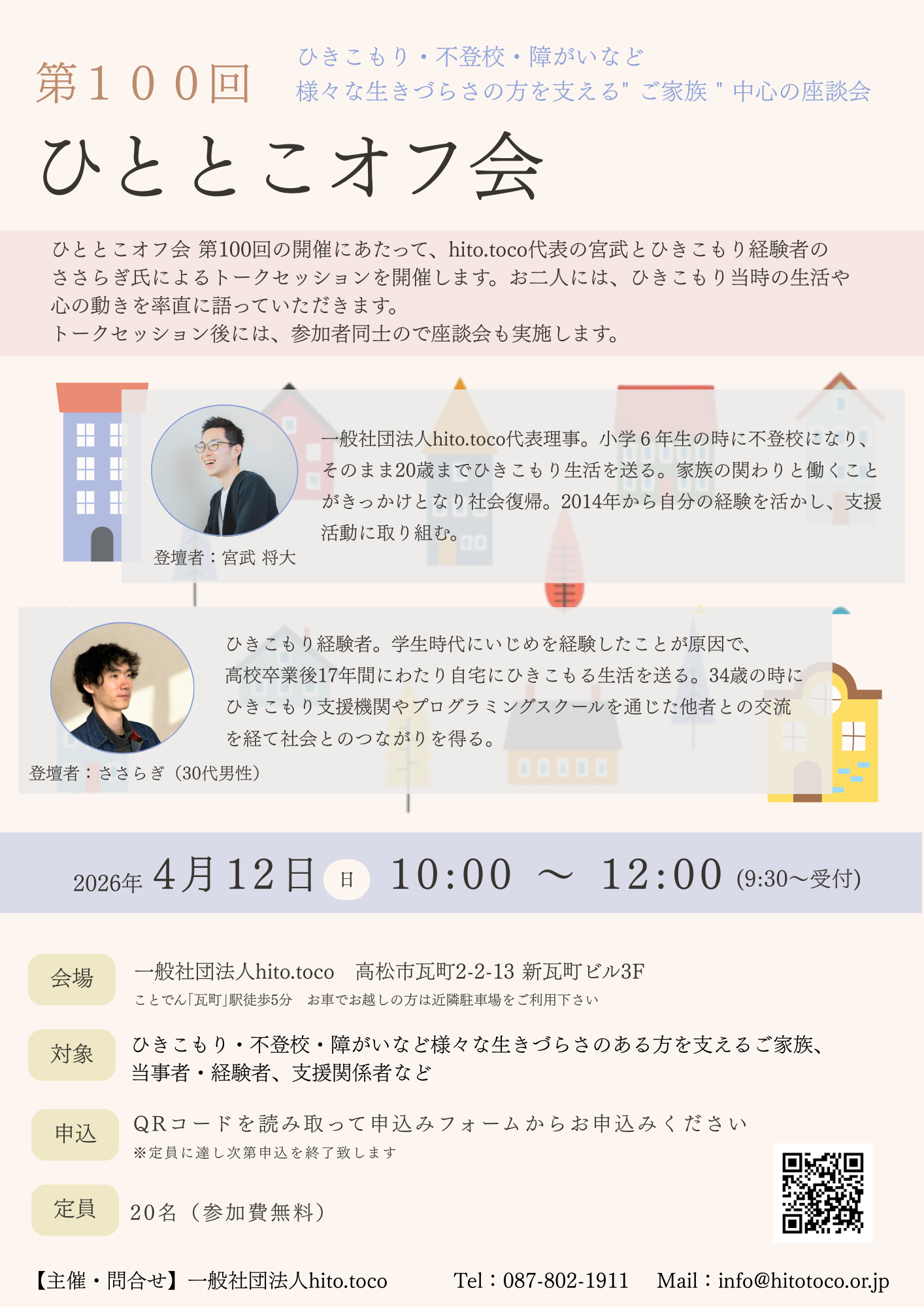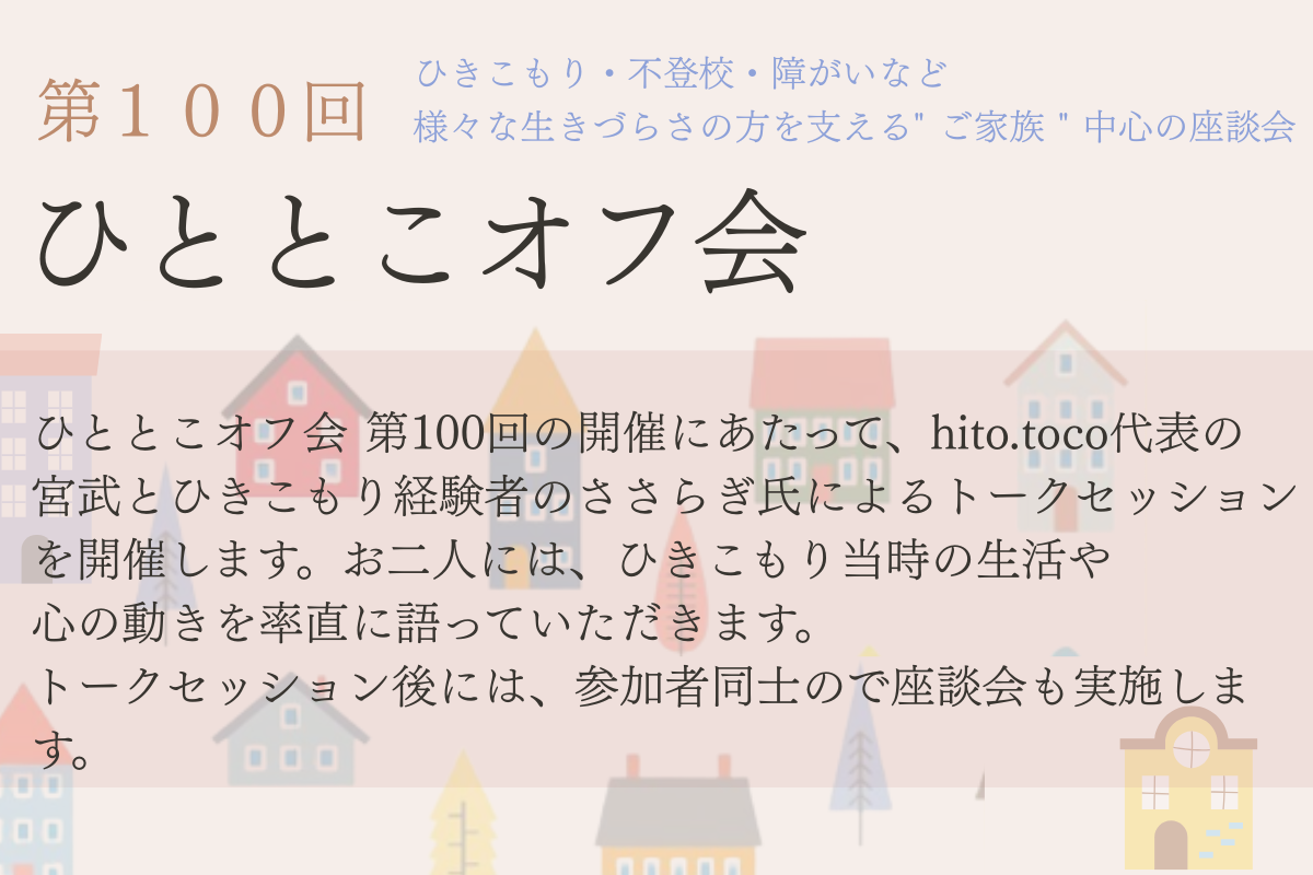 第100回を迎えるにあたり、hito.toco代表の宮武と、ひきこもり経験者のささらぎ氏によるトークセッションを開催します。