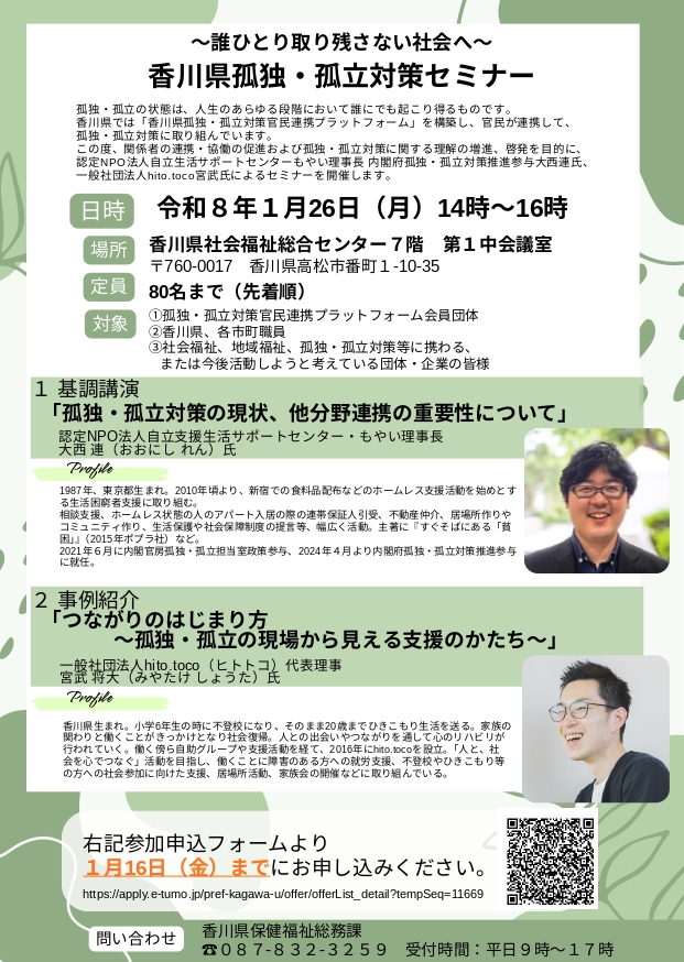 【ご案内】1/26(月)開催 ~誰ひとり取り残さない社会へ~香川県孤独・孤立対策セミナー開催のご案内
