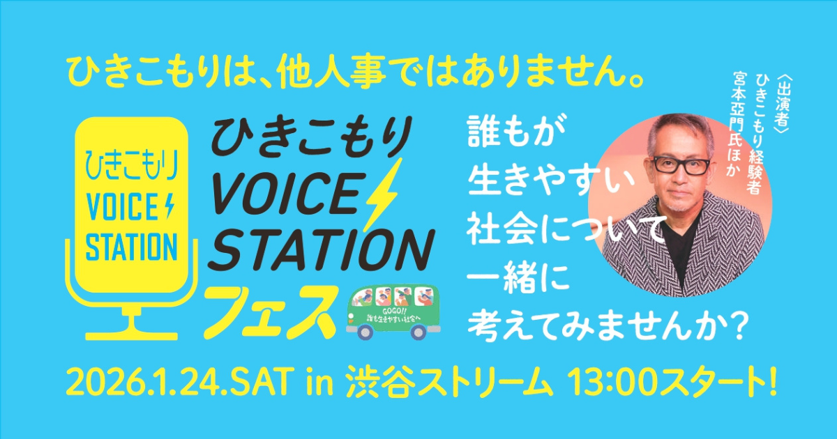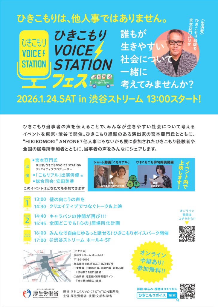 このたび、厚生労働省主催により「ひきこもりVOICE STATIONフェス」が、**1月24日(土)**に開催されます。